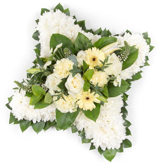 White chrysanthemums form the base of this traditional tribute. Available as pictured with a foliage edge or with a ribbon surround and spray in your choice of colours.