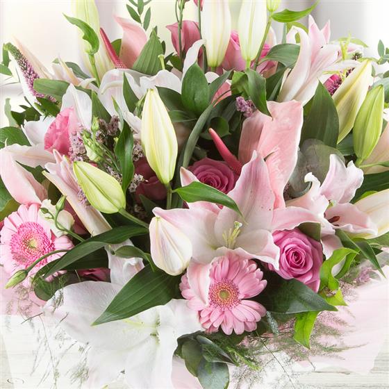 A sophisticated array of fragrant pink lilies, lime foliage, anthuriums and roses make this a stylish choice.