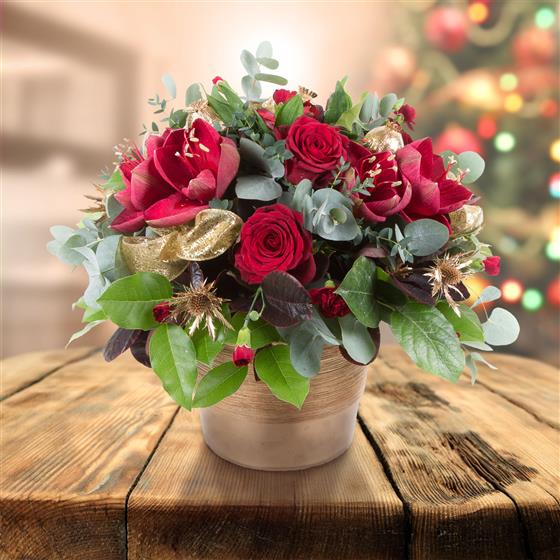 This beautiful arrangement includes amaryllis, long stemmed and spray red roses with a selection of seasonal foliage. Cones and silver clusters give this arrangement a stylish festive feel.