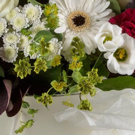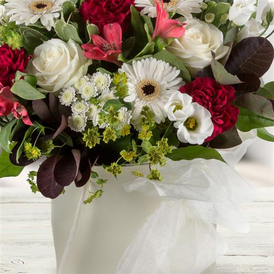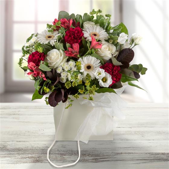 A sweet gift bag of ruby red alstromeria and carnations, white rose, mini gerbera and lisianthus.