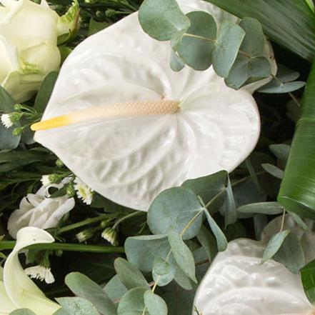 A simple combination of cream and white blooms and unusual greens. Anthuriums, lilies and roses are included in this stylish bouquet.