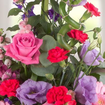 A beautiful, front facing arrangement in bright pinks, striking purples and lilacs.
